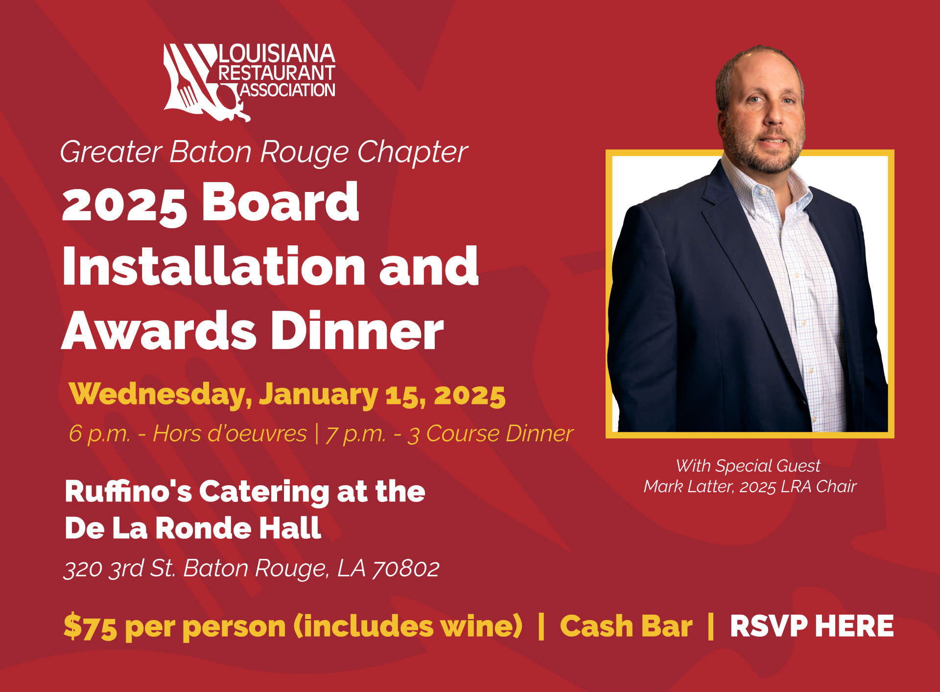 Join us for an elegant evening at the LRA Greater Baton Rouge Chapter Dinner as we welcome 2025 LRA State Chair Mark Latter of Latter Hospitality, who will deliver a keynote address. The evening will include the swearing-in of the 2025 Chapter Board of Directors and the presentation of awards honoring outstanding Chapter members. Festivities begin at 6 PM with hors d’oeuvres, followed by a three-course seated dinner at 7 PM, paired with wine. Tickets are $75 per person, and a cash bar will be available. Don’t miss this special celebration of our industry’s leaders and accomplishments!